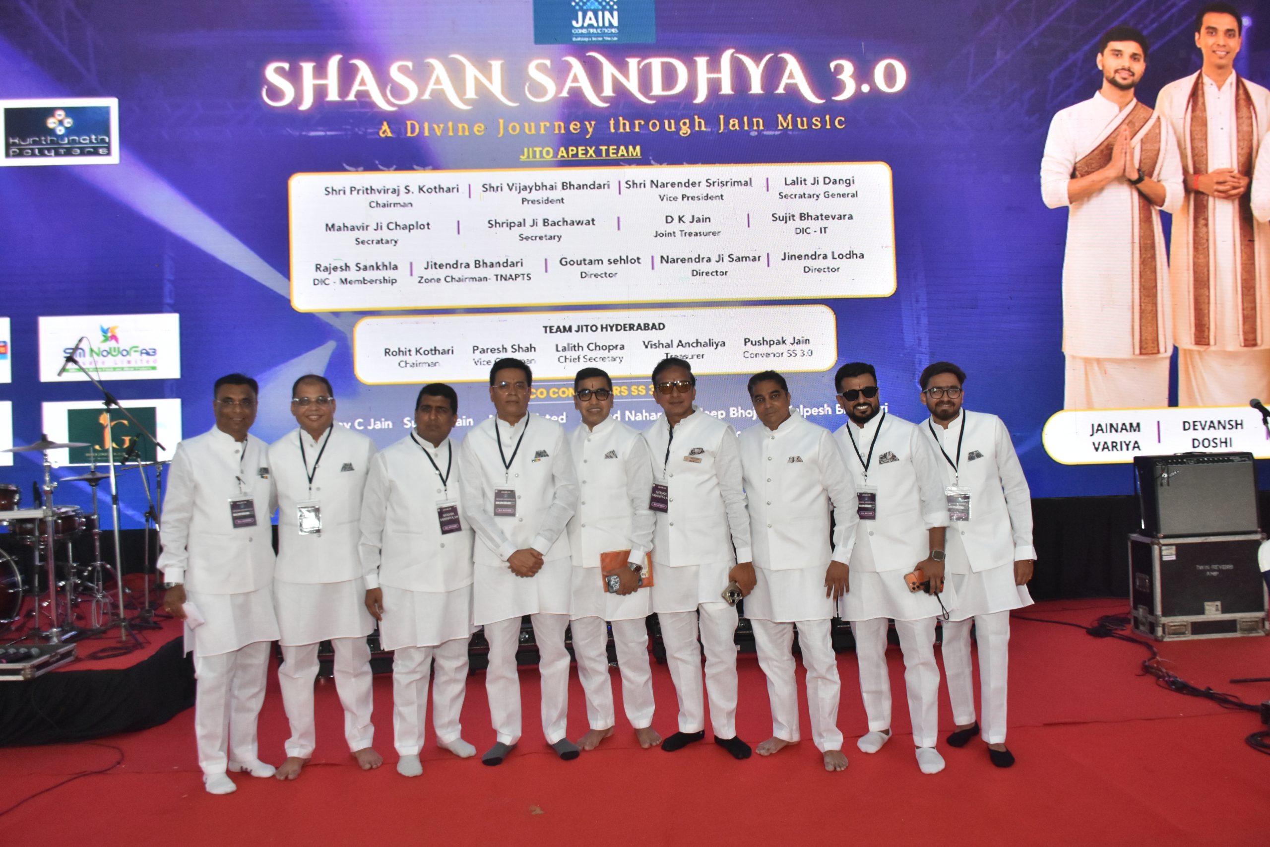 शासन संध्या 3.0 का उद्घाटन जीतो एपेक्स अध्यक्ष विजयभाई भंडारी, सचिव श्रीपाल बच्छावत, सह-कोषाध्यक्ष डी.के. जैन, डीआईसी आईटी सुजीत भटेवरा, डीआईसी सदस्य राजेश सांखला, जोन चेयरमैन टीएनएपीटीएस जितेन्द्र भंडारी, निदेशक गौतम सहलोत, निदेशक जितेन्द्र लोढ़ा, जीतो हैदराबाद चेयरमैन रोहित कोठारी, वाइस चेयरमैन परेश शाह, मुख्य सचिव ललित चोपड़ा, कोषाध्यक्ष विशाल आंचलिया, संतोष चापलोत, अजित सांखला सुजित भटेवरा, संजीव छाजेड जीनू लोढ़ा, एसएस 3.0 के संयोजक सदस्यों ने दीप प्रज्ज्वलन कर किया।