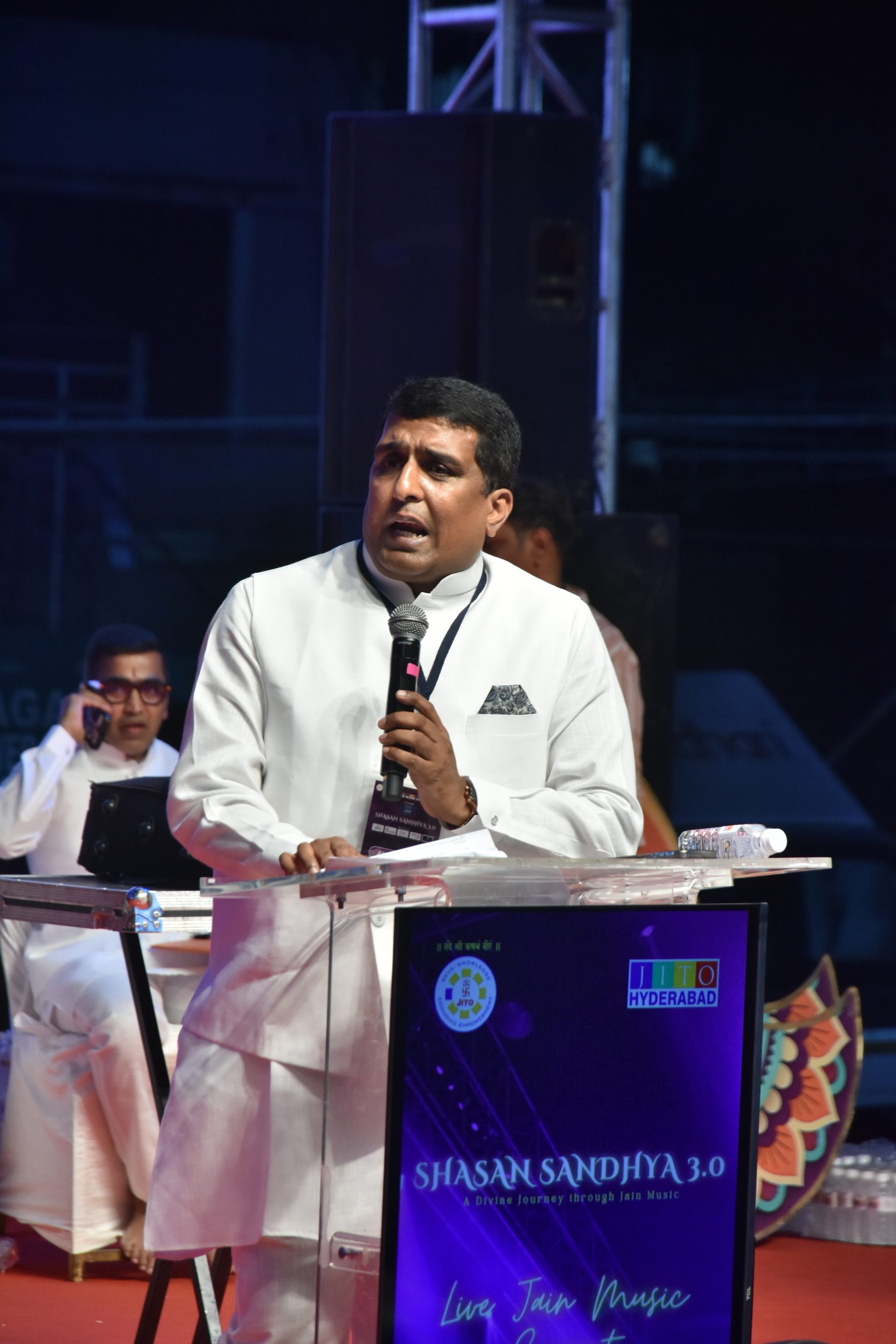 नुमाइश मैदान में जीतो लेडीज़, जीतो यूथ क्लब एवं जीतो हैदराबाद चैप्टर के संयुक्त तत्वावधान में आयोजित कार्यक्रम में प्रसिद्ध गायक जैनम वारिया, देवांश डोसी, पारस गाढा, प्रशांत शाह, हेम शाह, ईशान डोसी ने विश्व शांति के लिए दो मिनट के मौन के बाद भगवान महावीर स्वामी की प्रतिमा के आगमन का शब्दों से स्वागत किया। तत्पश्चात 7 नमस्कार महामंत्र के साथ प्रभु महावीर के पदों को समावेश कर वातावरण में भक्ति का रस घोल दिया। भजन गायकी से विशेष रूप से युवा पीढ़ी प्रभावित हुई। शासन संध्या का संचालन ईशान डोसी ने किया।