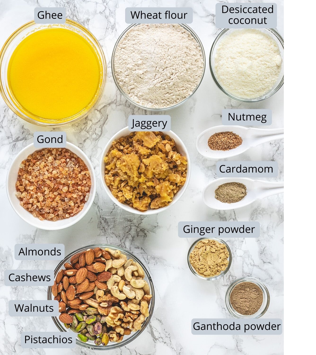 आवश्यक सामग्री – गेहूं का आटा 1 कप, बूरा (या पीसी चीनी) 1 कप, घी 1 कप, गोंद ? कप (100 ग्राम), काजू 10 से 12, खरबूजे के बीज 2 टेबल स्पून, इलाइची पाउडर आधा छोटा चम्मच।