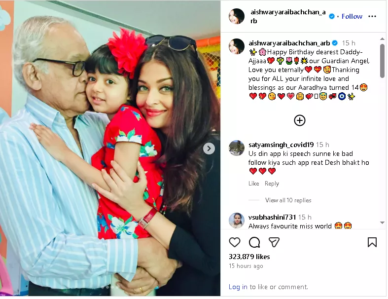 इसके अलावा, उन्होंने अपनी और आराध्या की वह तस्वीरें भी पोस्ट कीं जिनमें वे दोनों कृष्णराज राय की फ्रेम की हुई तस्वीर से आशीर्वाद लेते हुए दिखाई दे रही हैं। उन्होंने अपनी सोशल मीडिया पोस्ट में लिखा, ‘जन्मदिन मुबारक हो प्यारे पिता-अज्जा! हमारे अभिभावक देवदूत, हम आपसे हमेशा प्यार करेंगे। हमारी आराध्या के 14 साल के होने पर आपके असीम प्यार और आशीर्वाद के लिए धन्यवाद।’