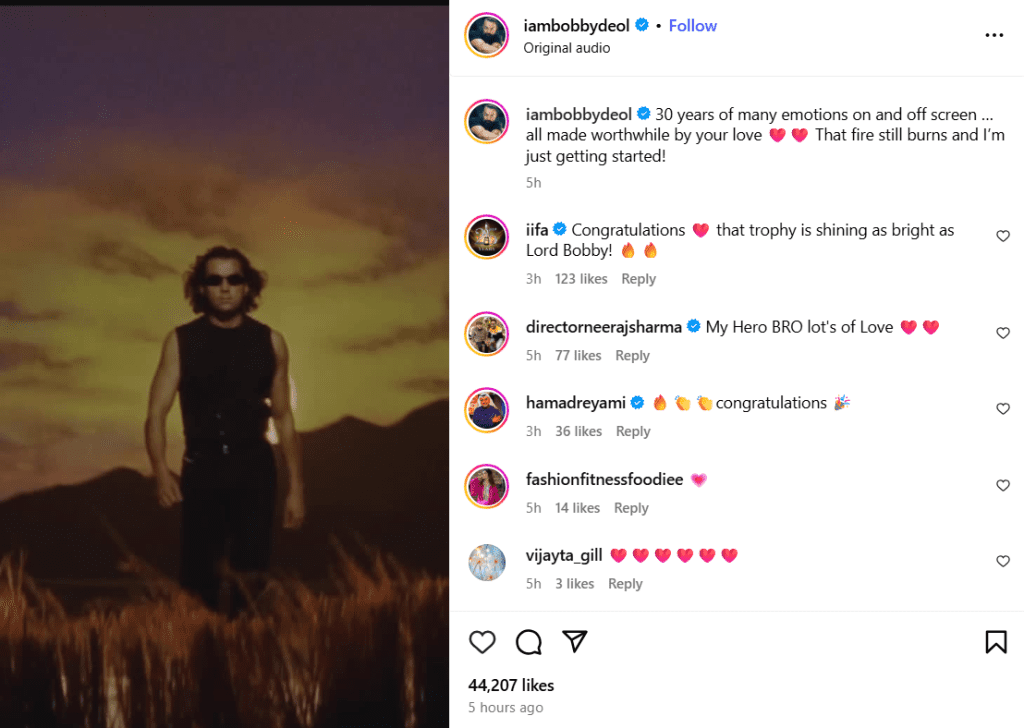 बॉबी देओल ने लिखा कि 30 साल की कई भावनाओं के साथ ऑन और ऑफ स्क्रीन। आपका प्यार इसे सार्थक बनाता है। वह आग अभी भी जल रही है और मैं बस शुरू कर रहा हूँ। उनके सहयोगियों ने अभिनेता को इंडस्ट्री में तीन दशकों पूरे होने पर बधाई दी। प्रीति जिंटा ने लिखा कि बधाई हो लॉर्ड बॉबी। यह सिर्फ शुरुआत है। बहुत सारा प्यार। दोनों अभिनेता फिल्म “सोल्जर” में एक साथ काम कर चुके हैं।