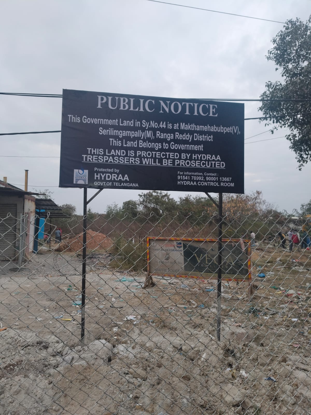 हैदराबाद, हैदराबाद आपदा प्रतिक्रिया एवं संपदा संरक्षण एजेंसी हैद्रा ने स्पष्ट किया है कि सरकारी भूमि के रूप में जिस स्थल को चिह्नित किया गया है, उसकी सुरक्षा के लिए फेंसिंग की जा रही है। पहले से निर्मित भवनों को नहीं तोड़ा जा रहा है।