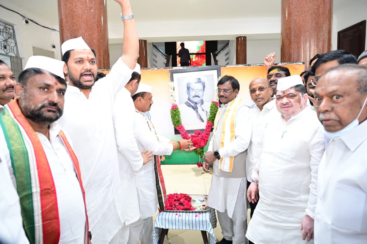 हैदराबाद, प्रदेश कांग्रेस के नेताओं ने पार्टी के 141वें स्थापना दिवस के मौके पर मुख्यालय गांधी भवन में राष्ट्रपिता महात्मा गांधी, प्रथम प्रधानमंत्री पंडित जवाहरलाल नेहरू और सरदार पटेल के चित्रों पर माल्यार्पण कर श्रद्धांजलि अर्पित की।