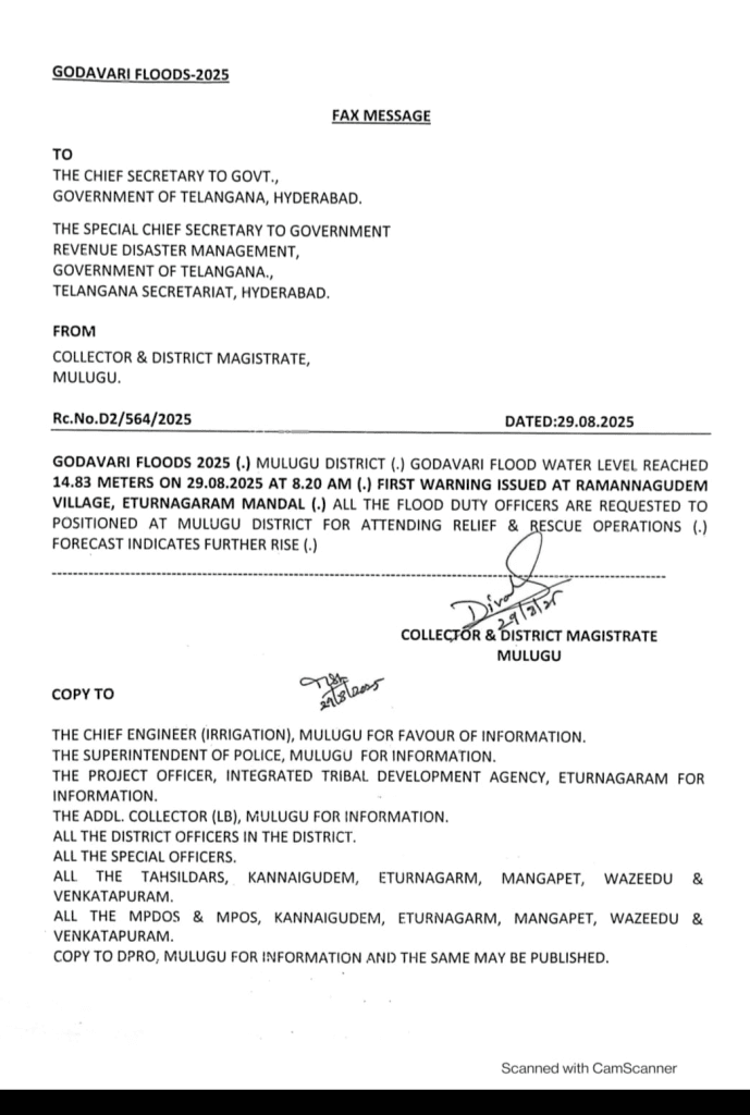मुलुगु के कलेक्टर एवं जिला मजिस्ट्रेट ने सभी बाढ़ नियंत्रण अधिकारियों को तुरंत तैनात रहने के निर्देश दिए हैं। जिला प्रशासन ने कहा कि राहत और बचाव कार्यों के लिए पूरी मशीनरी तैयार रखी जाए। मौसम पूर्वानुमान भी संकेत दे रहा है कि गोदावरी का जलस्तर आने वाले घंटों में और बढ़ सकता है।