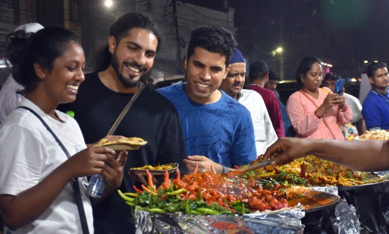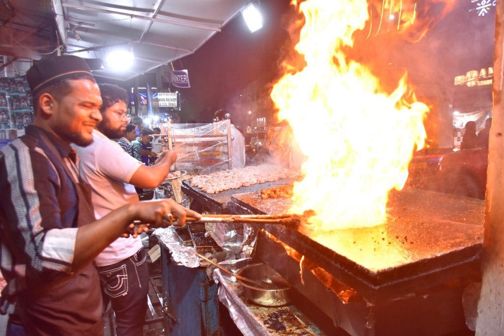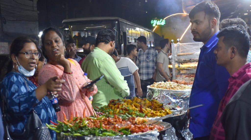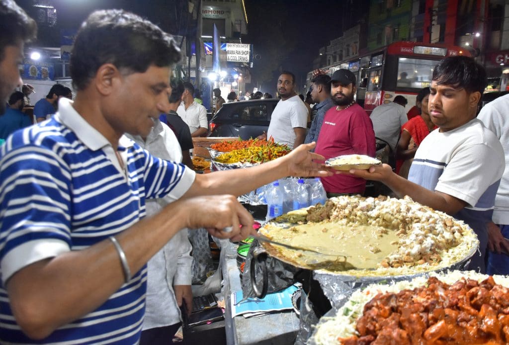 हैदराबाद के पुराने शहर के हुसैनी आलम में रमजान के दौरान स्ट्रीट प्रेमी पत्थर का गोश्त, मलाई कबाब, चिकन मलाई, पकोड़ा चिकन, समोसा चिकन, रोल चिकन स्वाद का आनंद लेते हुए। (फोटो : एम.ए. मुजीब)
