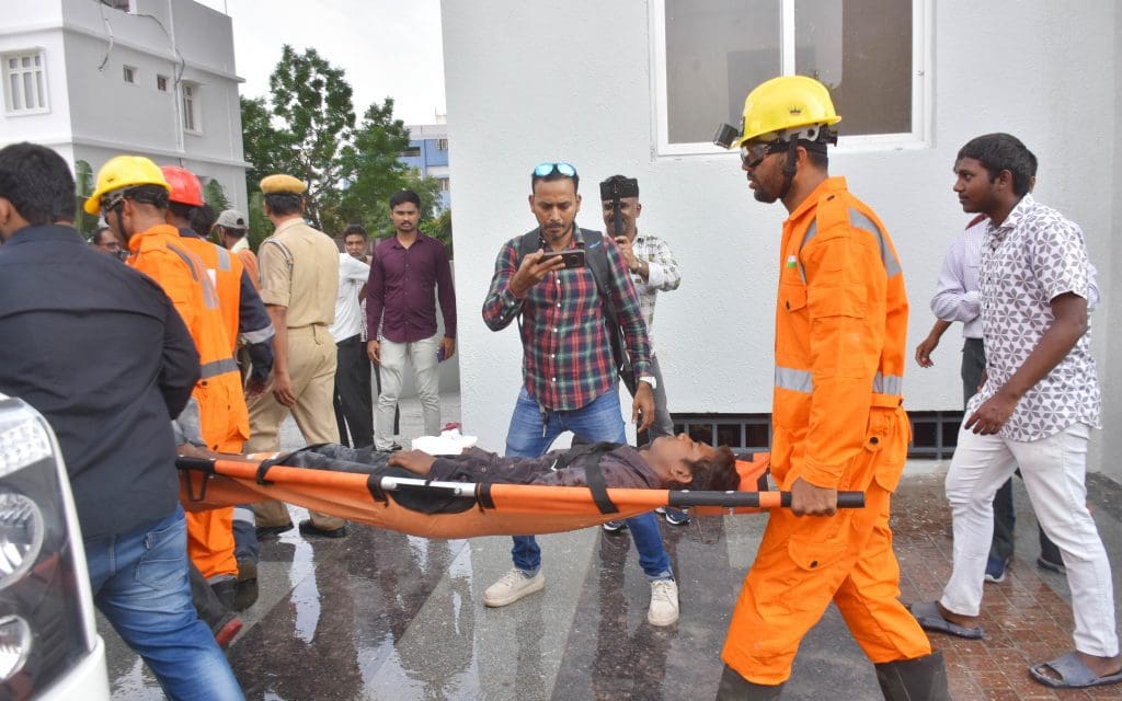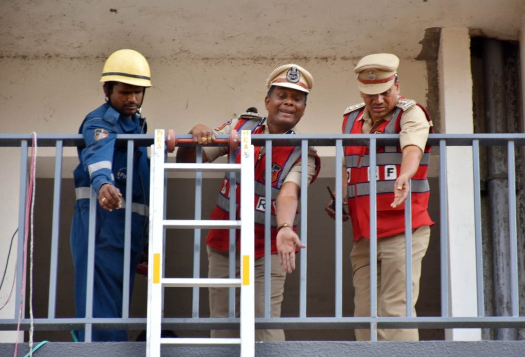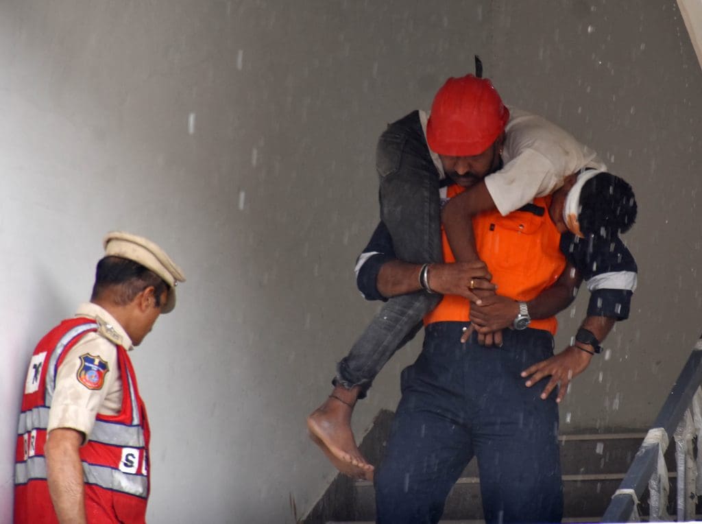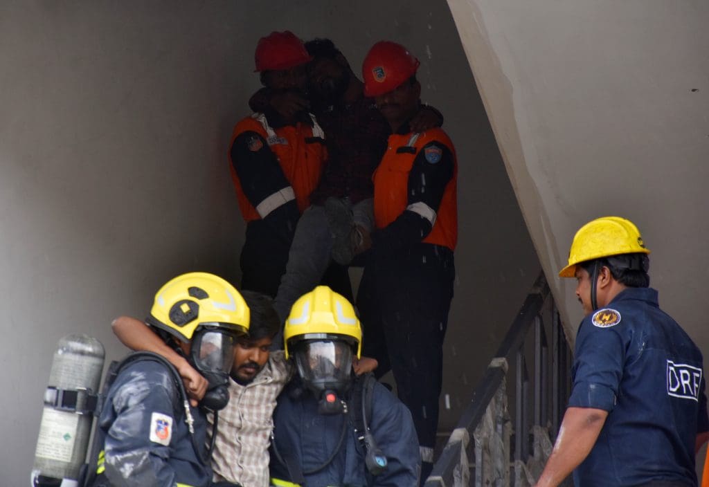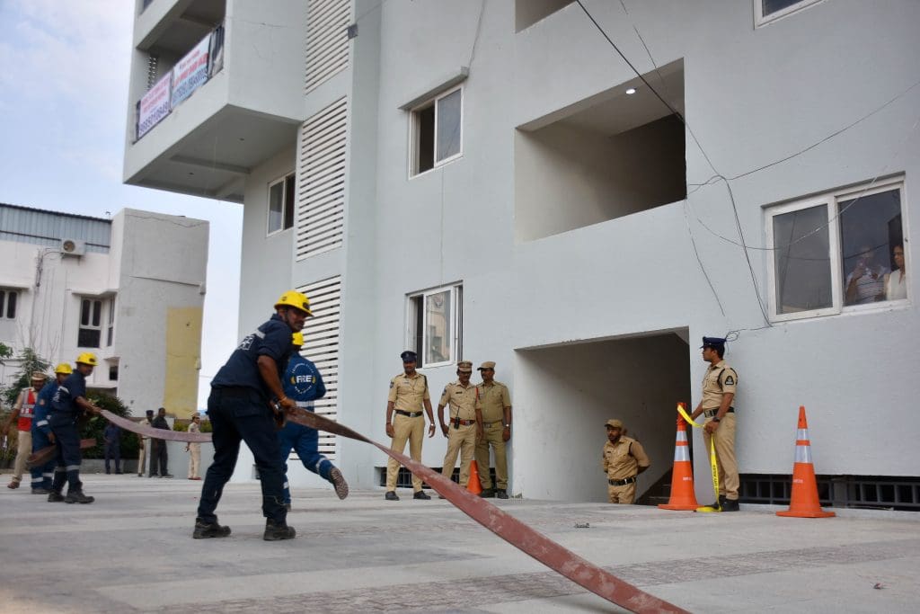 संतोष नगर, कंचनबाग स्थित बीपीएस ट्विन टॉवर में मॉक ड्रिल के दौरान राहत एवं बचाव कार्य के अभ्यास का दृश्य । (फोटो एम.ए. सरवर)