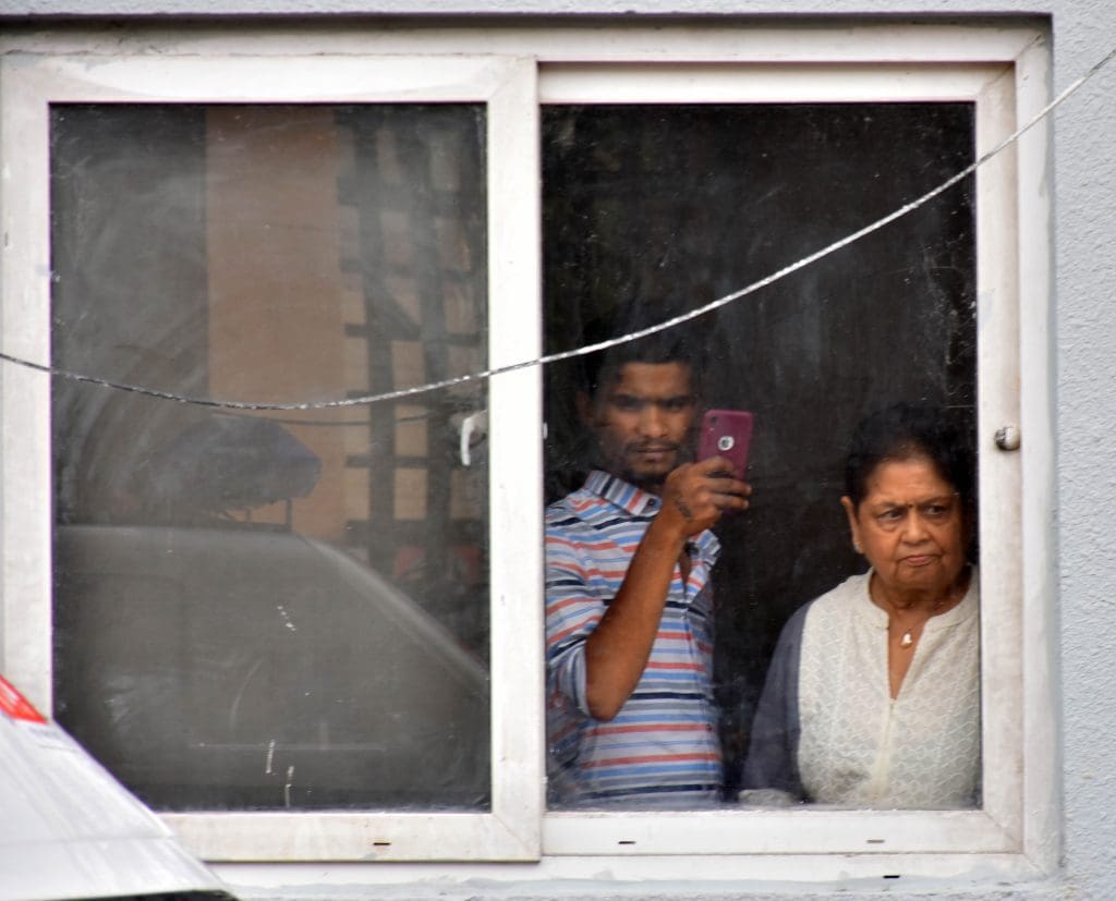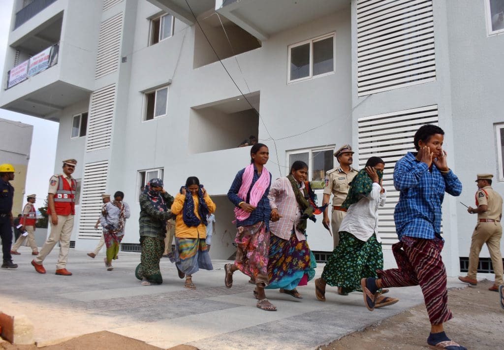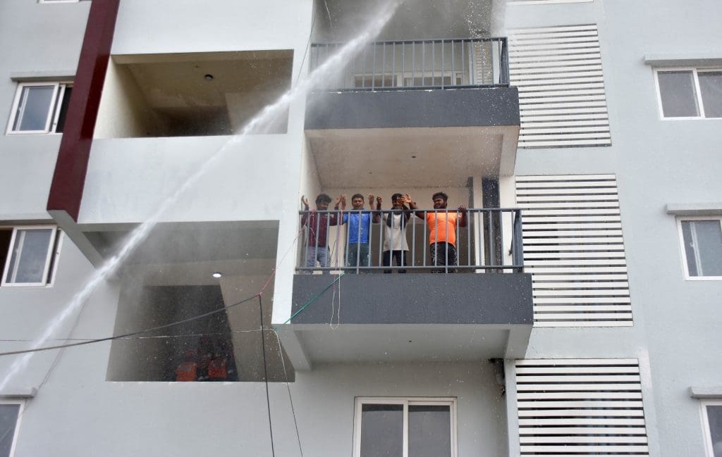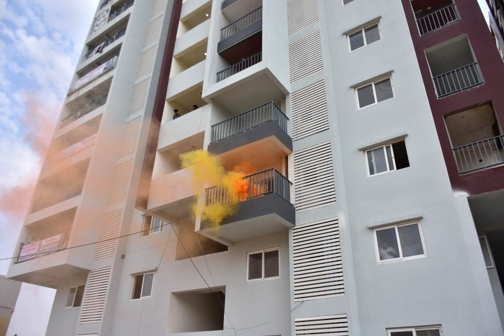 संतोष नगर, कंचनबाग स्थित बीपीएस ट्विन टॉवर में मॉक ड्रिल के दौरान राहत एवं बचाव कार्य के अभ्यास का दृश्य । (फोटो एम.ए. सरवर)