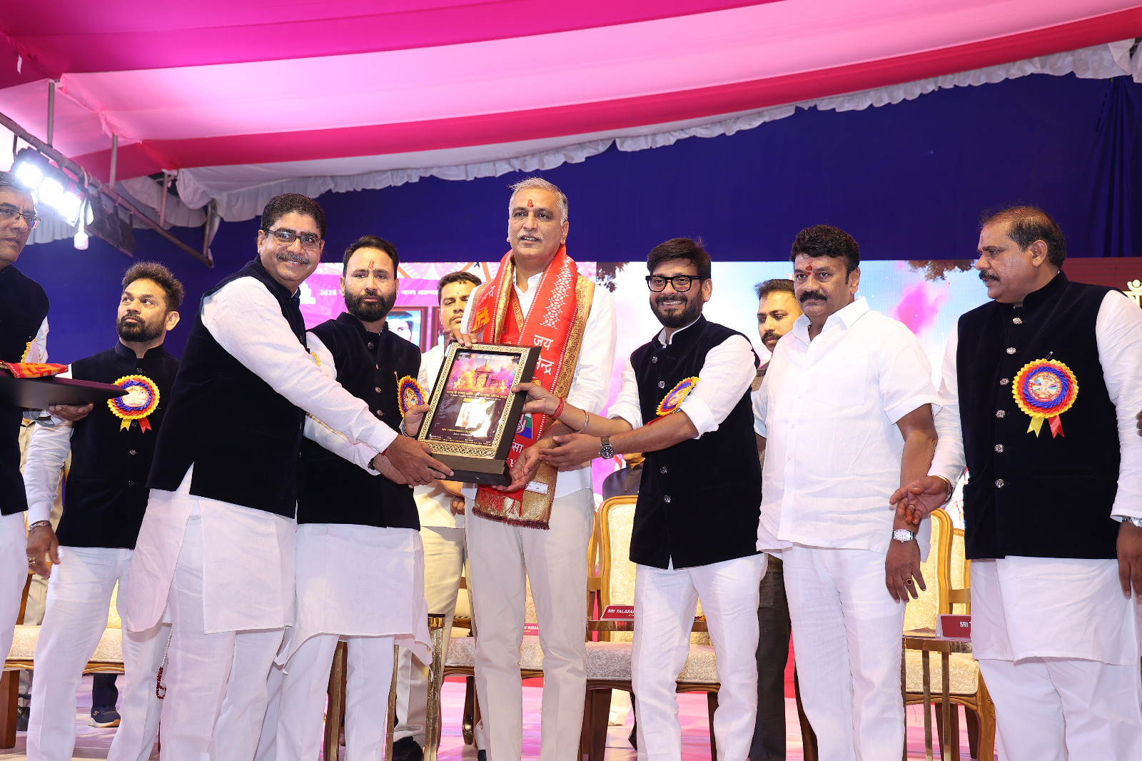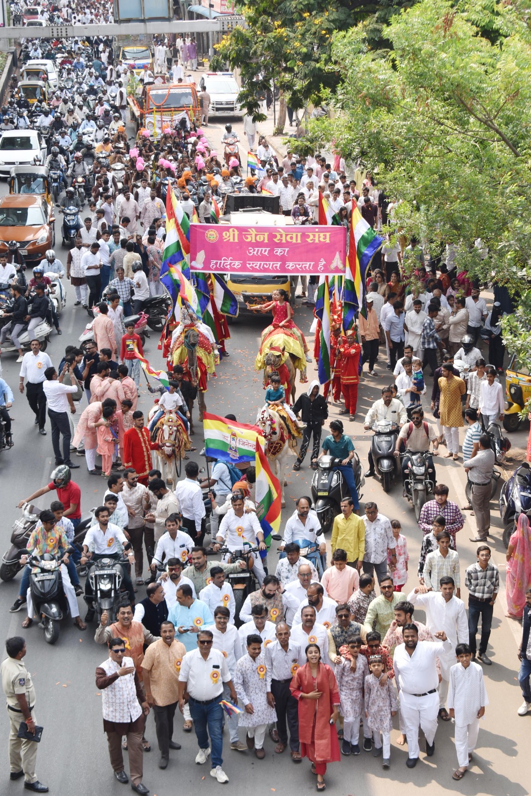 श्री पार्श्व गोयम कृपा प्राप्त जैनाचार्य विजय अभयसेन सूरीश्वरजी म.सा, पू.आ. श्री ऋषभचन्द्र सूरीश्वरजी म.सा. के समुदायवर्ती पू. मुनिराज श्री चन्द्रयशविजयजी म.सा. आदि ठाणा 2, महाशतावधानी मुनिराज श्री अभिनंदनचंद्र सागरजी म.सा. आदि ठाणा 5, अचलगच्छी गच्छाधिपति कलाप्रभ सागर सूरीश्वरजी म.सा. की आज्ञानुवर्ती साध्वी श्री तत्वपूर्णाश्रीजी म.सा. आदि ठाणा 3, पू. श्रीमद् विजय कल्पतरु सूरीश्वरजी म.सा. की आज्ञानुवर्ती साध्वी पू. कुमुदश्रीजी म.सा. की शिष्या पू. कल्पज्ञाश्रीजी म.सा. आदि ठाणा 5, सागर समुदाय पू. श्री हेमप्रभाजी म.सा. की सुशिष्या पू. भव्यपूर्णाश्रीजी म.सा. आदि ठाणा 3, पू. श्री भावरत्नाश्रीजी म.सा की शिष्या पू. सुकृतरत्नाश्रीजी म.सा. आदि ठाणा 3 के सानिध्य में आयोजित 2625वें भगवान महावीर जन्म कल्याणक महोत्सव-2026 के मुख्य अतिथि तेलंगाना के अल्पसंख्यक कल्याण मंत्री मो. अजहरुद्दीन एवं विशेष अतिथि बीआरएस के वरिष्ठ नेता तथा विधायक टी. हरीश राव एवं तलसानी श्रीनिवास यादव थे।