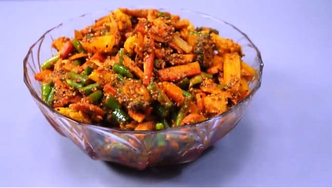विधि: सब्ज़ियों को धोकर छील लें। उन्हें छोटे-छोटे टुकड़ों में काट लें। उबलते पानी में डालकर उन्हें थोड़ा-सा पकाएँ। हरी मिर्च, नींबू, आम न उबालें। उबली सब्ज़ियों को छानकर सुखा लें। प्याज़-अदरक को धोकर छील लें। सरसों का तेल गरम करके उनमें अदरक-प्याज़ डालकर भूनें। फिर सारी सब्ज़ियाँ और मसाले डालकर कुछ देर भूनें। फिर उन्हें आँच से उतारें। उसमें गरम-गरम में ही ग्लेशियन एसिड मिलायें। थोड़े से पानी में सोडियम बेंजोएट घोलकर अचार में मिलायें। ठंडा होने पर उसे सूखे-साफ बरतन में भर लें।