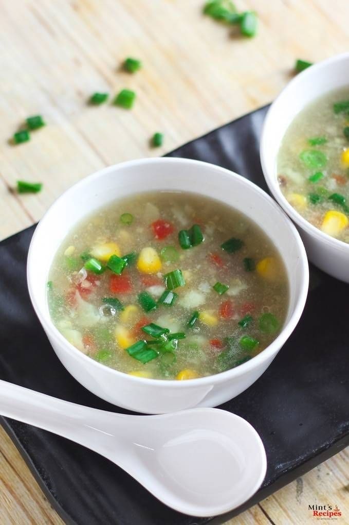 विधि : सब्ज़ियों को बारीक काट लें। ऑलिव ऑयल में अदरक-लहसुन का पेस्ट, प्याज और टमाटर भून लें। अब इसमें सब्जियाँ डालकर 3 से 4 मिनट तक भूनें। इसमें 2 गिलास पानी डालें करीब 10 मिनट तक उबलने दें। इसमें काली मिर्च, काला नमक और 2 चम्मच कॉर्न फ्लार पानी में घोलकर सूप में मिलाएं। इसे लगातर मिलाते रहें, ताकि गांठें न बनें। 10 मिनट और पकाएं और गरमा-गरम सर्व करें।