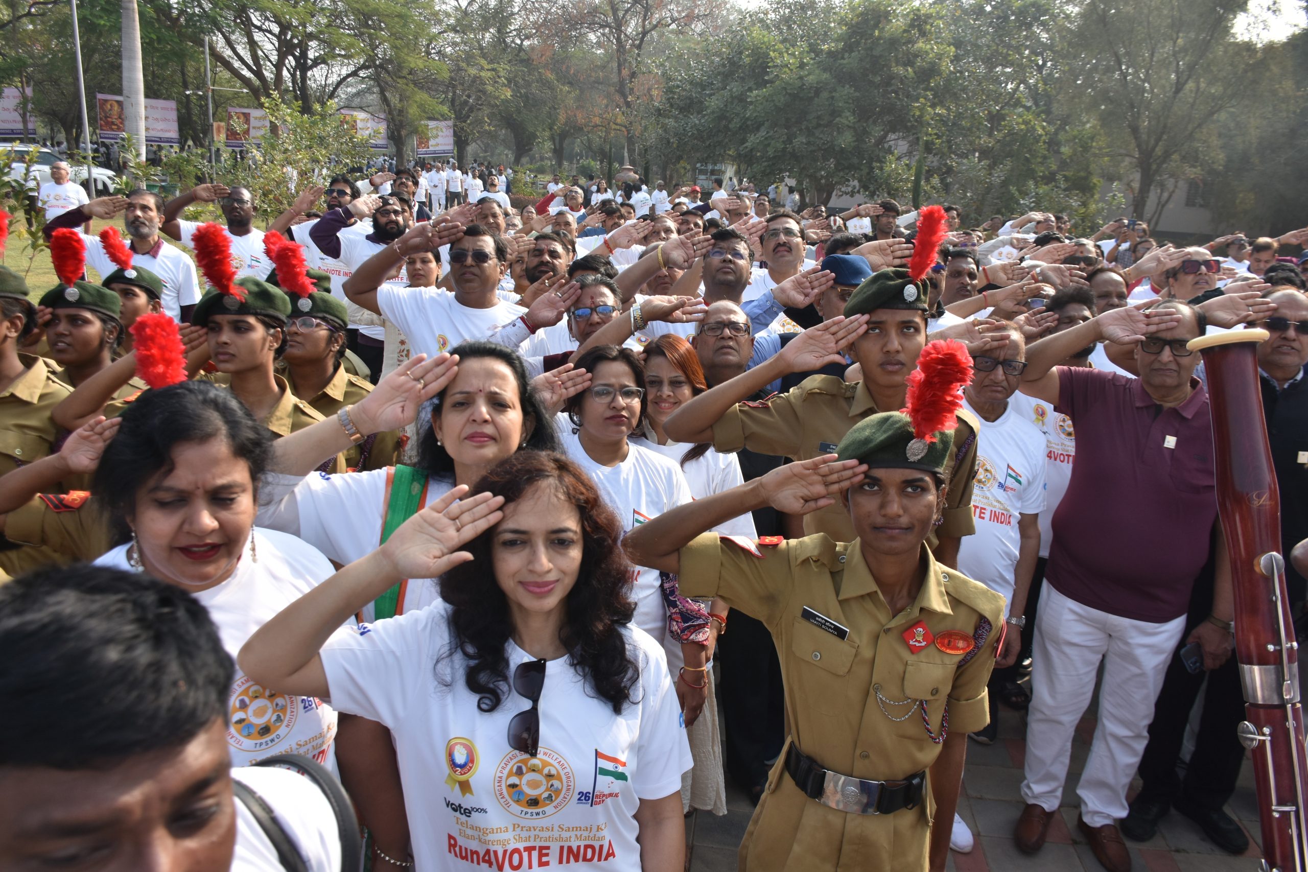 कार्यक्रम में बड़ी संख्या में नागरिक ज़ुम्बा वार्मअप सत्र के लिए इकट्ठा हुए। सत्र को वनीश्री और वर्तिका ने संचालित करते हुए आकर्षक और शानदार प्रस्तुति के साथ प्रतिभागियों को प्रेरित किया। तत्पश्चात आर्मी बैंड द्वारा वंदे मातरम् की प्रस्तुति दी गई, जिसने माहौल को देशभक्ति के गौरव और राष्ट्र के प्रति सम्मान से भर दिया। सभी का स्वागत तेलंगाना प्रवासी समाज कल्याण संगठन ( टीपीएसडब्ल्यूओ) के मुख्य संयोजक सुभाष अग्रवाल ने किया। उन्होंने इस बात पर ज़ोर दिया कि मतदान लोकतंत्र की नींव है और हर नागरिक का वोट राष्ट्रीय सेवा का शक्तिशाली साधन है।