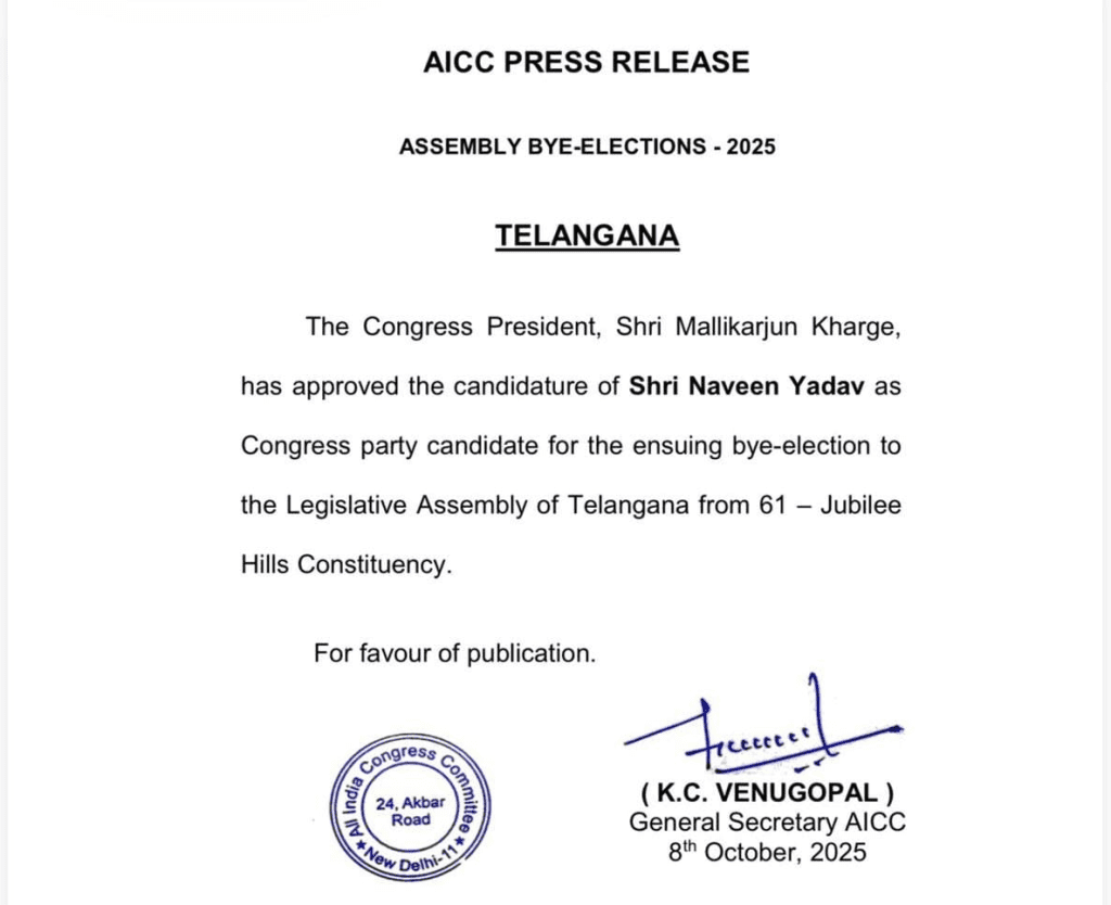पार्टी महासचिव केसी वेणुगोपालाचारी ने बताया कि कांग्रेस अध्यक्ष मल्लिकार्जुन खड़गे ने तेलंगाना विधान सभा के जुबली हिल्स निर्वाचन क्षेत्र के आगामी उपचुनाव के लिए कांग्रेस पार्टी के उम्मीदवार के रूप में नवीन यादव की उम्मीदवारी को मंजूरी दे दी है।