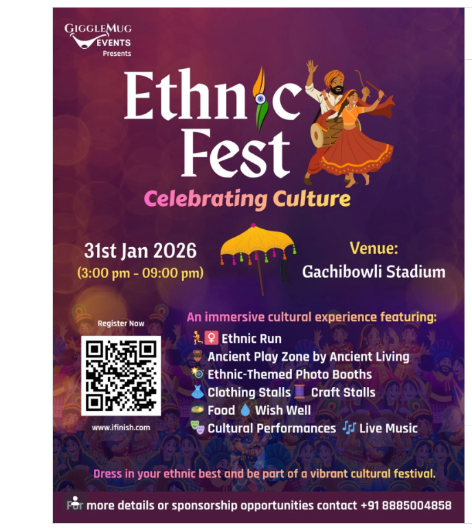 GiggleMug Events द्वारा प्रस्तुत एथनिक फेस्ट 2026 31 जनवरी को दोपहर 3 बजे से रात 9 बजे तक गच्चीबावली स्टेडियम को रंग, संगीत और परंपरा के जीवंत संसार में बदल देगा। यह सिर्फ एक आयोजन नहीं, बल्कि भारतीय सांस्कृतिक विरासत को जीने और महसूस करने का अवसर है।