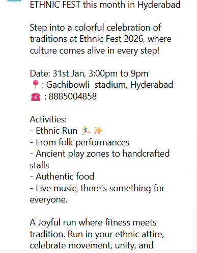 एथनिक फेस्ट 2026 हैदराबाद के कैलेंडर का सिर्फ एक और कार्यक्रम नहीं है। यह एक सांस्कृतिक आंदोलन है, जो शहरवासियों को अपनी जड़ों से जुड़ने और गर्व के साथ अपनी परंपराओं का जश्न मनाया जाएगा।”