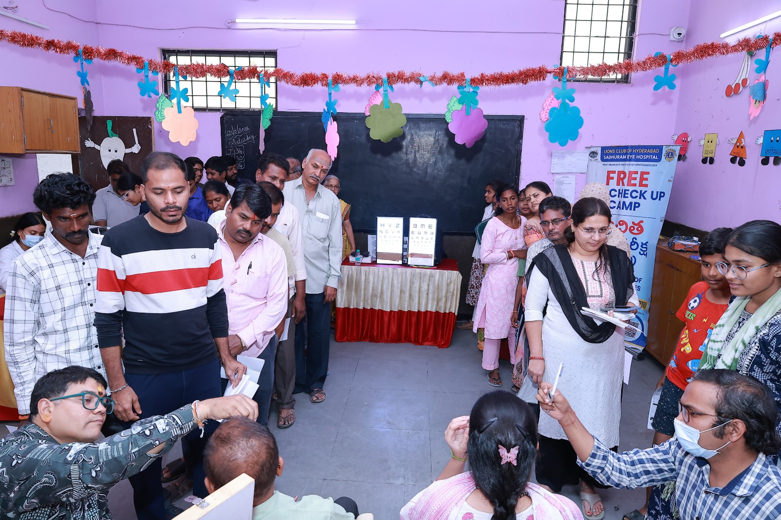 अवसर पर लॉयंस क्लब ऑफ हैदराबाद साधुराम आई हॉस्पिटल, दोमलगुड़ा द्वारा नेत्रों की जांच की गई, जिसमें 178 रोगियों में से 75 को नि:शुल्क चश्मों का वितरण किया गया और 1 रोगी के मोतियाबिन्द ऑपरेशन की व्यवस्था की गई। अवसर पर अजीत कश्यप, एच. भगवान, प्रतीक्षा, के नर्सिंग राव एवं के. भास्कर ने सेवा प्रदान की। डॉ. अखिल क्लीनिक (पूरणदास रणछोड़दास) के जनरल फिजिशियन डॉ. अखिल सुगंधी ने भी सेवा प्रदान की। फिज़ियोथेरेपी की सेवा बजाज फिजियो केयर की डॉ. मीता बजाज ने दी। दंत परीक्षण की सेवा सीनियर डेंटल डॉ. एस. नवनीत राज एवं डॉ. एस. निखिल राज ने प्रदान की। अवसर पर 290 रोगियों ने स्वास्थ्य जाँच करायी।