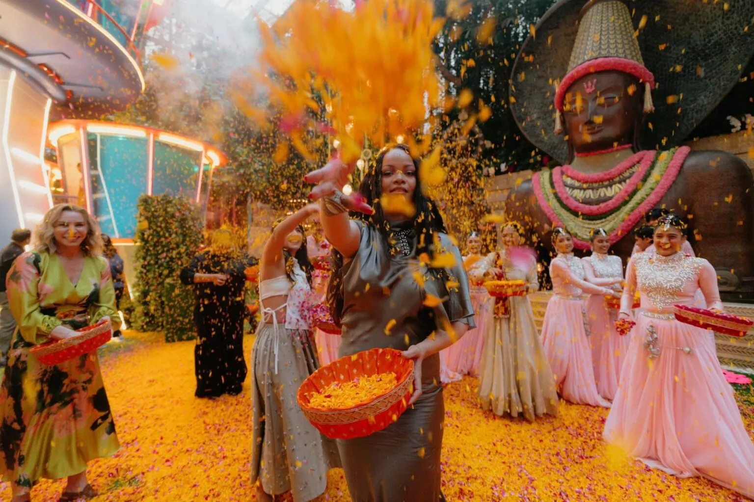 कार्यक्रम की शुरुआत एक शांतिपूर्ण पूजा से हुई, जिसमें रिहाना ने भी भाग लिया। सोशल मीडिया पर सामने आए वीडियो में वह मुस्कुराते हुए भारतीय रीति-रिवाजों का आनंद लेती नजर आईं।