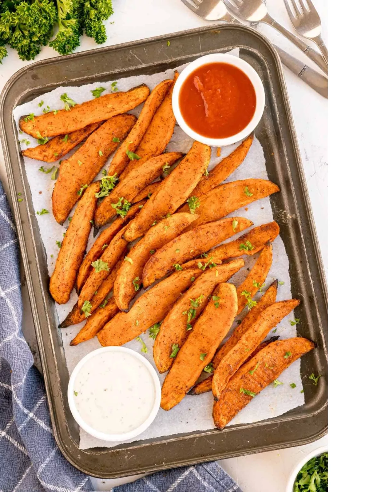 ओवन को लगभग 430 डिग्री पर प्रीहीट करें। शकरकंद को धो कर आधा करें और समान आकार के वेजेज में काट लें। एक्ट्रा क्रिस्पी करने के लिए उन्हें अच्छी तरह से सुखा लें। एक बड़े बाउल में इन वेजेज पर ऑलिव ऑयल डालें और सारे मसाले मिलाकर उनपर डालें। सभी वेजेज पर हल्के मसाले की कोटिंग होनी चाहिए। इन वेजेज को बेकिंग ट्रे में पार्चमेंट पेपर बिछाकर रखें और 15-20 मिनट तक उलट-पलट कर सुनहरा होने तक बेक करें। टोमैटो केचप, चीज़ी डिप या चिपोटल सॉस के साथ सर्व करें।
