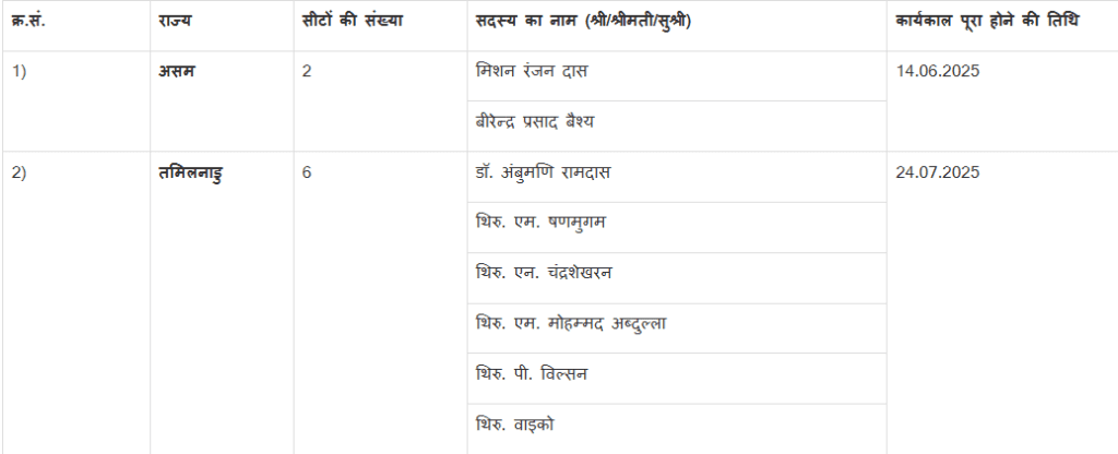 नई दिल्ली, भारत निर्वाचन आयोग ने असम और तमिलनाडु से राज्यसभा के लिए द्विवार्षिक चुनाव कराने का निर्णय लिया है। इन राज्यों से राज्यसभा के आठ वर्तमान सदस्यों का कार्यकाल जून-जुलाई 2025 में समाप्त हो रहा है। आयोग ने इन रिक्तियों को भरने के लिए चुनाव कार्यक्रम की घोषणा कर दी है।