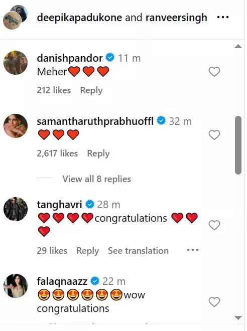 दीपिका पादुकोण के पोस्ट पर फैंस बधाई दे रहे हैं। साथ ही कई सेलेब्स ने भी रिएक्शन दिए हैं और कपल को बधाई दे रहे हैं। परिणीति चोपड़ा, अनन्या पांडे, सामंथा रुथ प्रभु, कियारा आडवाणी, फलक नाज, दानिश पंडोर सहित कई सेलेब्स ने बधाई दी है और रेड हार्ट इमोजी पोस्ट किए हैं।
