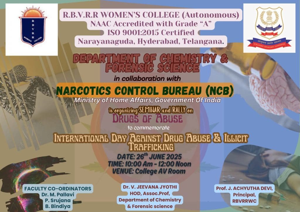 हैदराबाद, राजा बहादुर वेंकट राम रेड्डी महिला महाविद्यालय के रसायन विज्ञान एवं फॉरेंसिक साइंस विभाग ने नारकोटिक्स कंट्रोल ब्यूरो (NCB), हैदराबाद के सहयोग से नशीली दवाओं के दुरुपयोग और अवैध तस्करी के विरुद्ध अंतर्राष्ट्रीय दिवस के अवसर पर जागरूकता रैली का आयोजन किया।