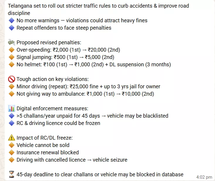 हैदराबाद, तेलंगाना सरकार सड़क दुर्घटनाओं पर लगाम लगाने और ट्रैफिक अनुशासन सुधारने के लिए सख्त नियम लागू करने की तैयारी में है। प्रस्तावित नए नियमों के तहत अब ट्रैफिक उल्लंघनों पर चेतावनी नहीं, बल्कि सीधे भारी जुर्माना लगाया जाएगा। बार-बार नियम तोड़ने वालों के खिलाफ कड़ी कार्रवाई की जाएगी।