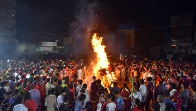 रंगों के त्योहार होली पर होलिका दहन के दौरान भक्त अलाव के चारों ओर नृत्य करते