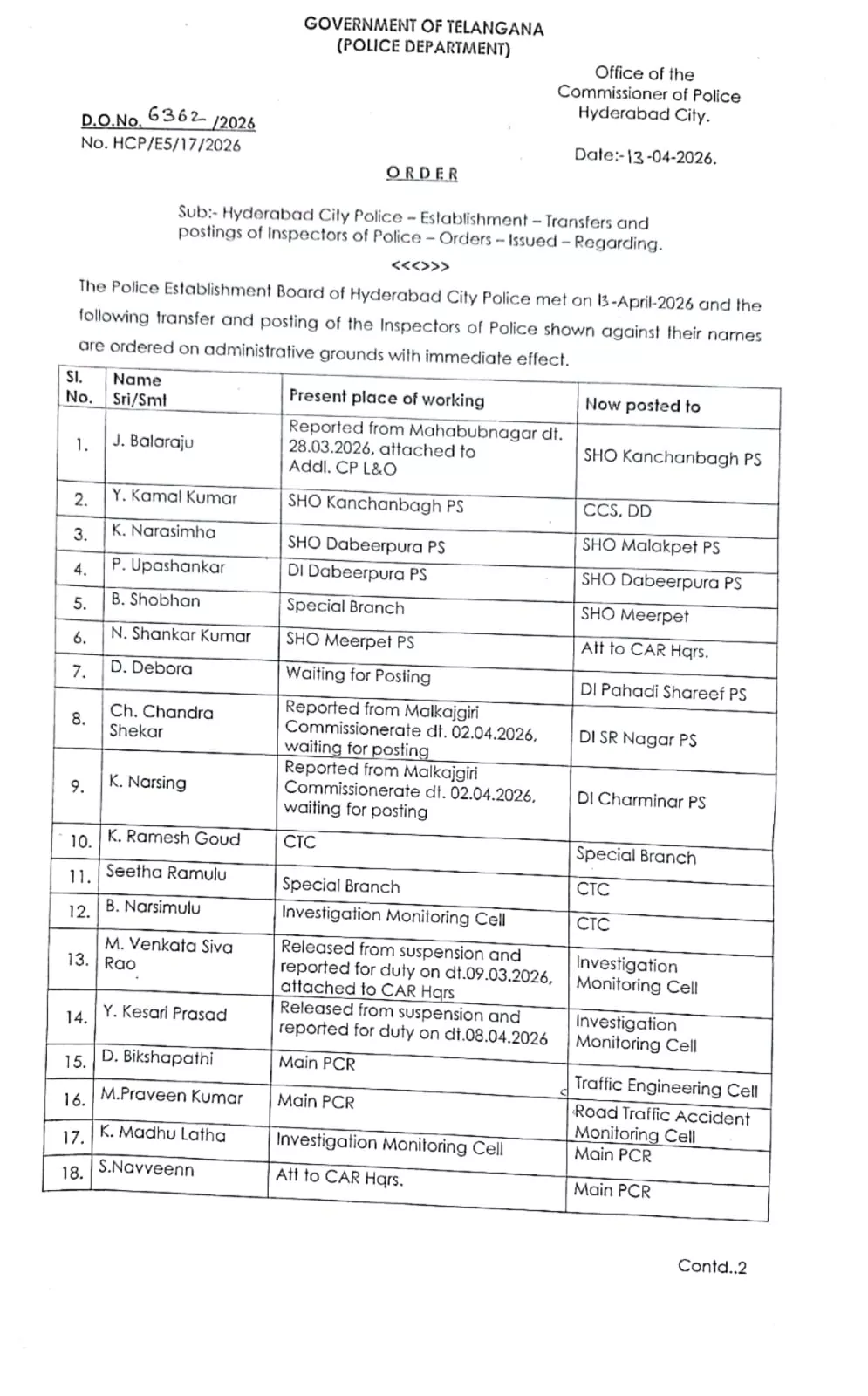 विशेष शाखा में कार्यरत बी. शोभन को मीरपेट तथा एन. शंकर कुमार को सीएआर मुख्यालय में अटैच किया गया। डी. देबोरा जो अब तक पोस्टिंग का इंतजार कर रहे थे, उन्हें पहाड़ी शरीफ थाने में डीआई नियुक्त किया गया। इसके अलावा, मलकाजगिरी कमिश्नरेट से आए चंद्रशेखर और के. नरसिंग को एसआर नगर और चारमीनार थानों में डीआई के रूप में तैनात किया गया।