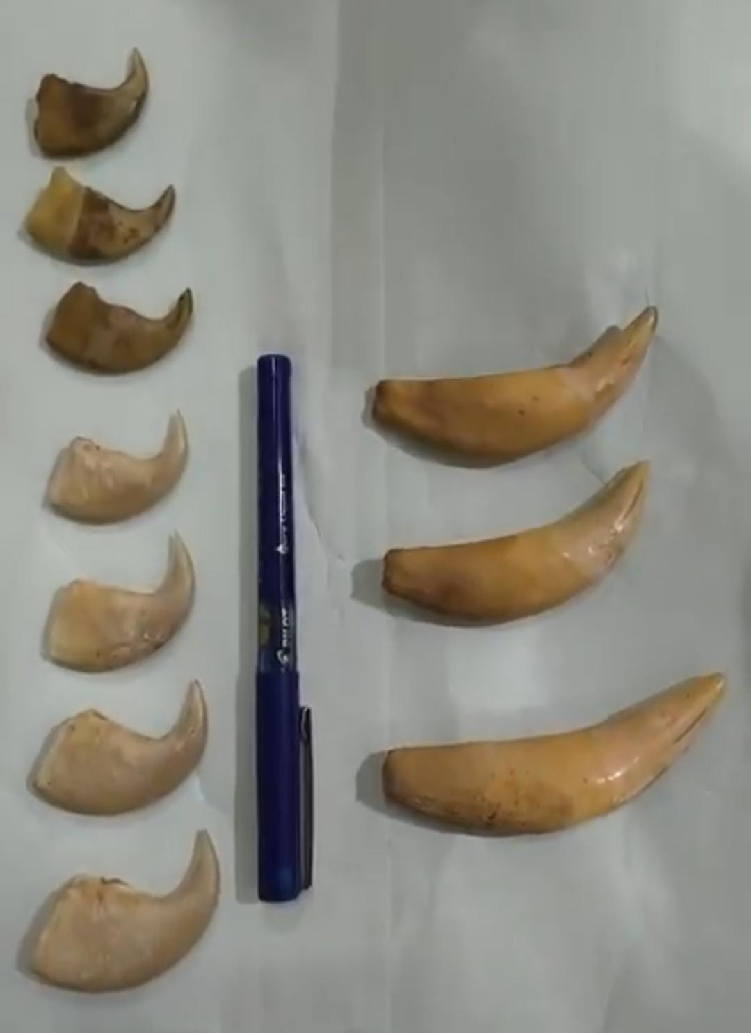 डीआरआई अधिकारियों ने संदिग्ध गतिविधियों के आधार पर दोनों तस्करों को रोका और पूछताछ की। पूछताछ के दौरान आरोपियों में से एक ने अपने बैकपैक से एक पारदर्शी ज़िप-लॉक पाउच निकाला। जांच करने पर उसमें बाघ के सात नाखून और तीन कैनाइन दांत पाए गए।