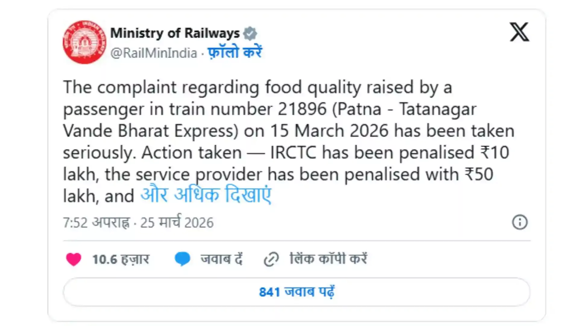 शिकायत की पुष्टि होने के बाद रेल मंत्रालय ने त्वरित कार्रवाई करते हुए खान-पान की व्यवस्था संभालने वाली निजी कंपनी का अनुबंध (कॉन्ट्रैक्ट) तुरंत प्रभाव से रद्द कर दिया है। कैटरिंग कंपनी पर 50 लाख रुपये का जुर्माना लगाने के साथ ही उसे भविष्य के लिए ब्लैकलिस्ट करने की प्रक्रिया भी शुरू कर दी गई है। रेलवे के अनुसार, इस तरह की लापरवाही को किसी भी कीमत पर बर्दाश्त नहीं किया जाएगा, खासकर उन ट्रेनों में जहाँ यात्री उच्च गुणवत्ता वाली सेवाओं के लिए प्रीमियम किराया चुकाते हैं।