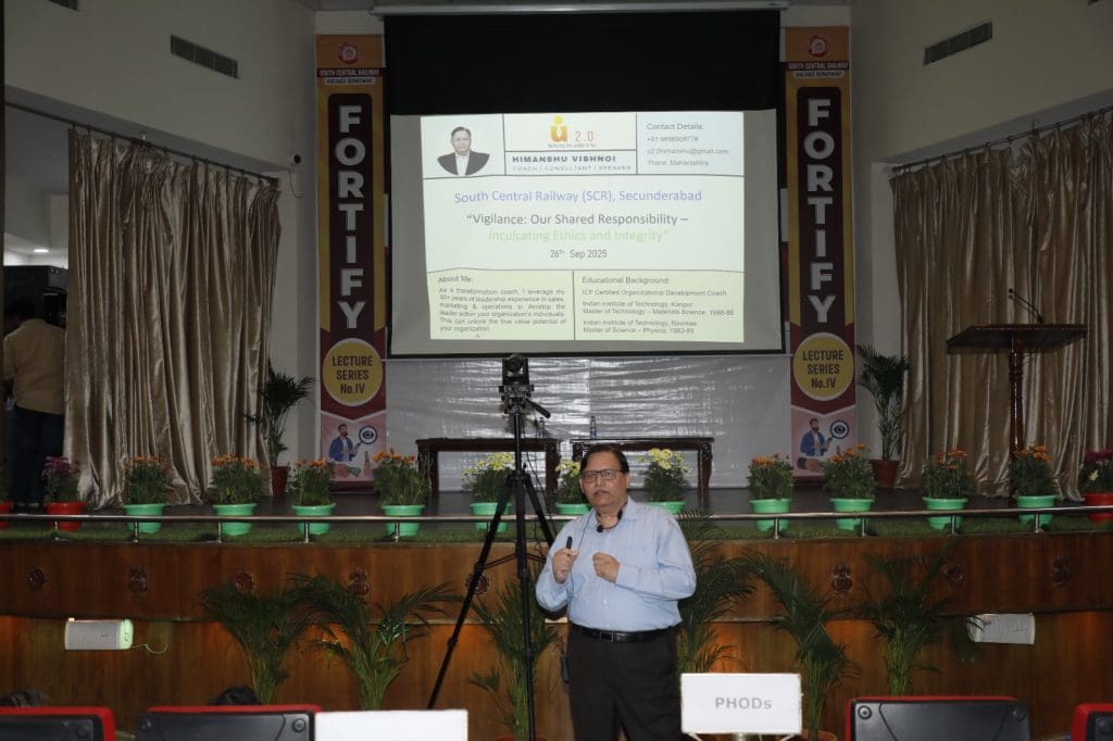 हैदराबाद, दक्षिण मध्य रेलवे की सतर्कता शाखा के तत्वावधान में सतर्कता जागरूकता सप्ताह के अंतर्गत व्याख्यान का आयोजन किया गया। प्रसिद्ध कॉर्पोरेट कोच और प्रबंधन सलाहकार हिमांशु विश्नोई ने संगठन के मूल्यों तथा नैतिकता पर विस्तार से चर्चा की।