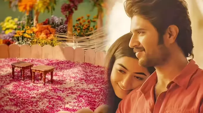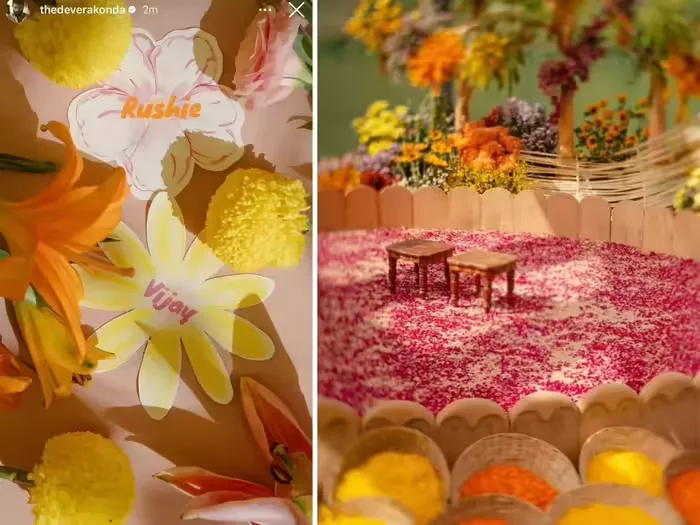 एक तस्वीर में फूलों की चादर से जमीन ढकी है और उसके बीचोंबीच दो टेबल रखे नजर आ रहे हैं, जो दूल्हे राजा विजय देवरकोंडा और होने वाली दुल्हन रश्मिका मंदाना के लिए हैं। दूसरी तस्वीर में रश्मिका और विजय के नाम के दो फ्लोरल प्लेकार्ड हैं। इनमें से एक पर रश्मिका का निकनेम- रूशी लिखा हुआ है।
